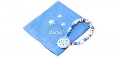 Grâce à ses nombreuses couleurs et au nom brodé (max: 10 symboles) votre doudou et votre attache-tétine seront unique!